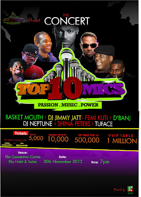 It promises to be a clash of music heavyweights on Friday, November 30, 2012 at the prestigious Eko Hotel and Suites, Victoria Island, Lagos as the likes of 2face, Dbanj, Basketmouth, Femi Kuti and others lock horns on stage at this year’s edition of the TOP10MICS concert.